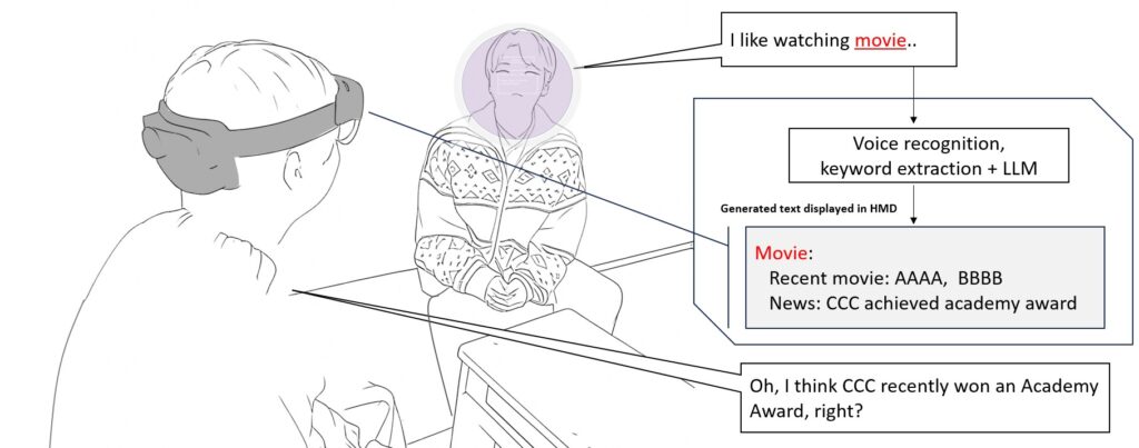 対面対話は社会生活を送る上で欠かせない活動であるが、他者との対面対話を苦手とし、また恐怖する者は多く、それが高じた引きこもり状態にある人は日本に100万人以上いるとされる。これに対する従来の主な医学的対処は、各種訓練であったが、訓練場面においての介入が中心で、現実社会への汎化が困難であるため、症状緩和までに年月を要するという本質的な問題があった。これに対し、本研究では現実社会でのリアルタイムの介入が可能な方法として、拡張現実感技術(AR)と頭部装着型ディスプレイ(HMD)を日常装着する将来を想定し、対話時に常時介在してユーザをサポートする方法を明らかにすることを目的とする。その中で対話相手との知識量と思考速度の差を埋めるために、大規模言語モデル(LLM)を利用することを提案する。具体的には、システムが対話中の音声を自動認識し、キーワード抽出し、それに関連する情報を関係する会話の手がかりとして、テキスト表示する。また、会話中のアイコンタクトを維持できるようにテキスト表示位置を動的に制御するインタフェースもあわせて提案している。実験の結果、対話中の自然な視線行動を維持しつつ、会話を盛り上げる効果があることが示された。現在は第二段階として、自分の分身AIモデルの構築や、状況に応じた支援制御に取り組んでいる。